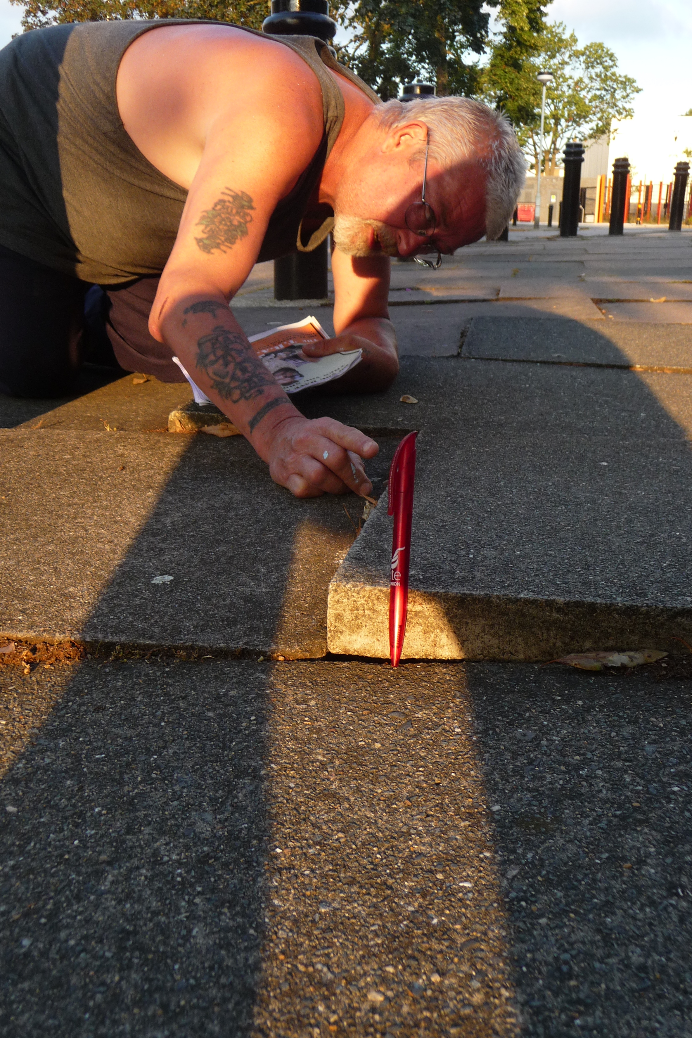 The paving on Abbots Park has deteriorated badly. We took these pictures of the paving on Tuesday 22nd July. To give you an idea of how misaligned the paving slabs are, the pen shown is 15cm long.