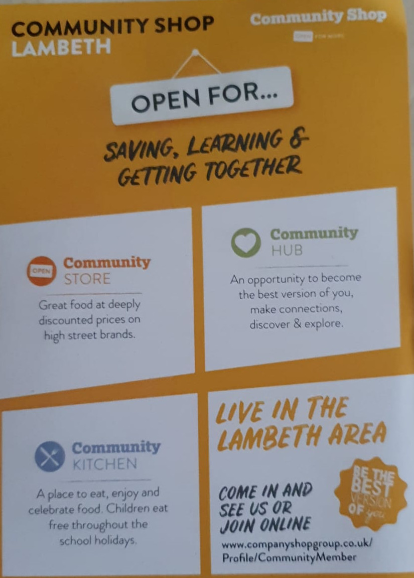 A local residents has asked me to advertise a community shop in West Norwood she is involved with. It provides members with discounted food, meals for £1.50 and learning and development programmes.
