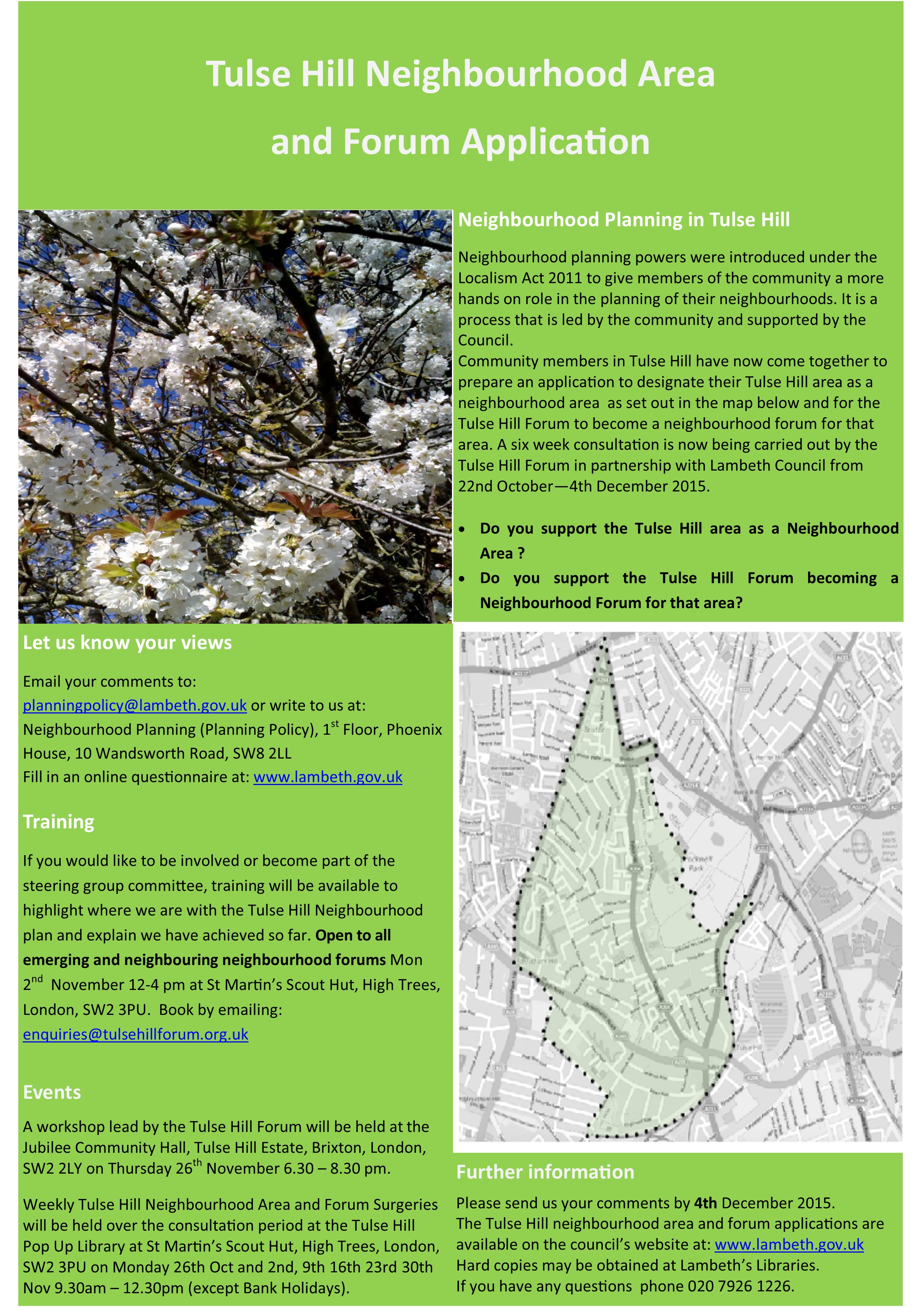 Community members in Tulse Hill have now come together to prepare an application to designate their Tulse Hill area as a neighbourhood area and for the Tulse Hill Forum to become a neighbourhood forum for that area. A six week consultation is now being carried out by the Tulse Hill Forum in partnership with Lambeth Council. It ends on 4th December
