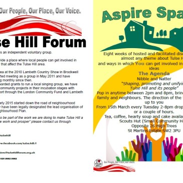 Tulse Hill Forum and hosting eight weeks of facilitated discussions on almost any theme about Tulse Hill and ways in which you can get involved in moving these ideas